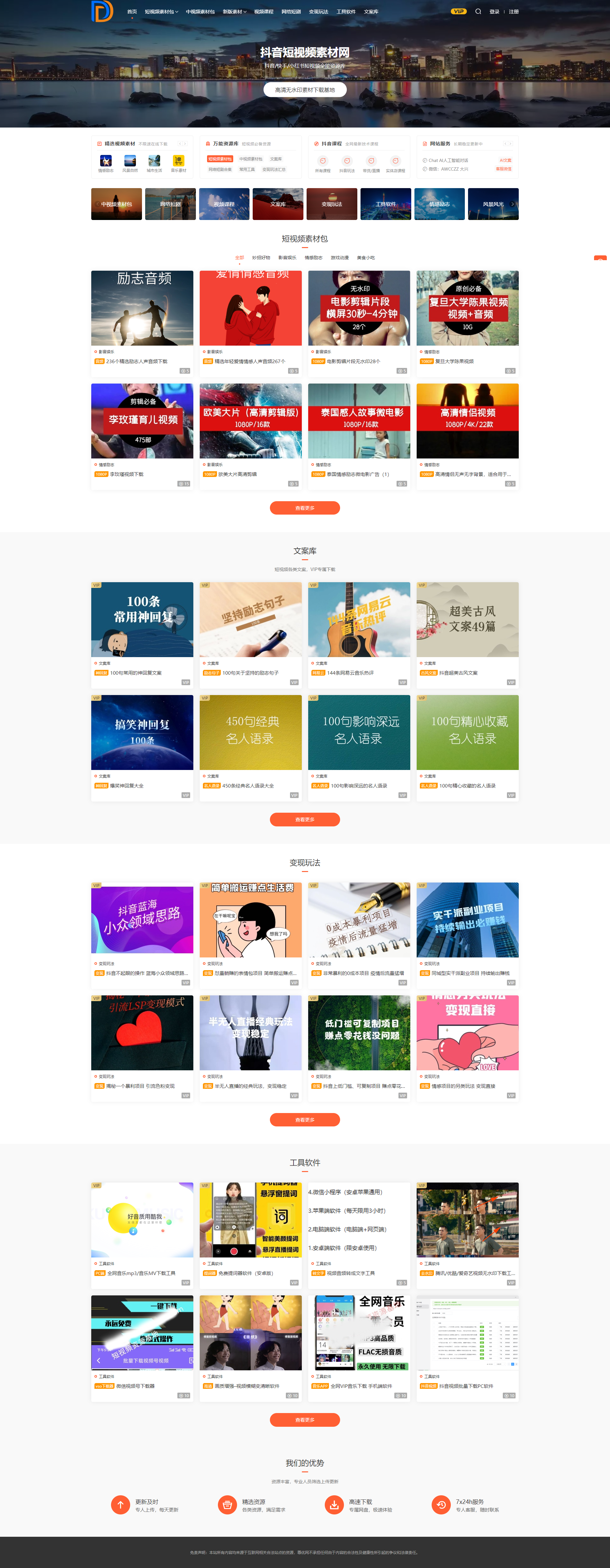 主要包括情感励志短视频素材,生活小妙招,美食,影视MV,健康养生,好物种草,心理学,风景航拍等30个多分类。